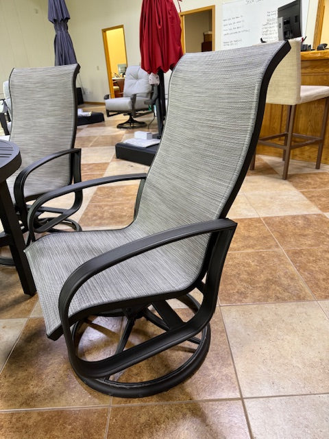 High Back Swivel Rockers in Twilight Finish and Watercolor Tweed Pearly Sling Fabric.